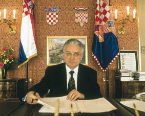 here is General Tudjman surrounded by Ustasha Emblems in his cabinet.